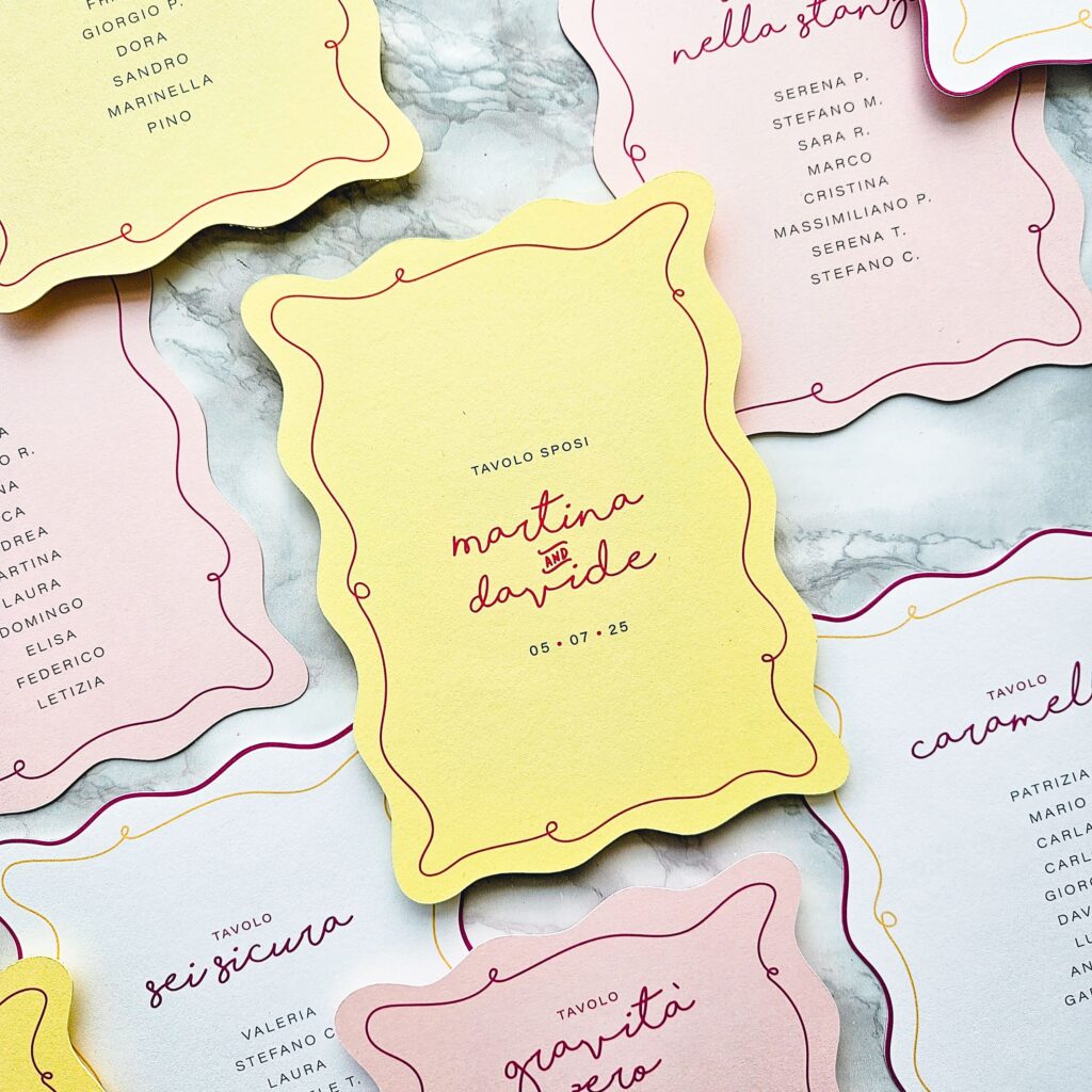 Coordinato grafico: poi vedremo tutti quegli elementi che vi accompagneranno il giorno delle nozze, come menu, tableau, tag bomboniera, ventagli, libretti messa e tante altre cose. Ovviamente tutto coordinato e coerente con l’invito realizzato in precedenza!
